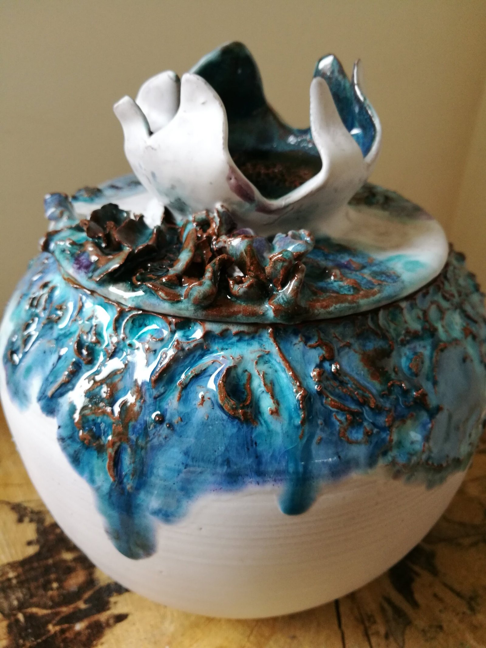 Aan de ene kant maak ik gebruiksvoorwerpen die ik kleurrijk decoreer. Het krijgt voor mij extra betekenis wanneer deze objecten een rituele of ceremoniële functie hebben. Zo maakte ik een set bekers met kan voor een huwelijk en een serie ceremoniële bekers voor een vrouwencirkel. Ook het maken van een urn of verdeelurn voor een dierbare ervaar ik als zeer waardevol en bijzonder.