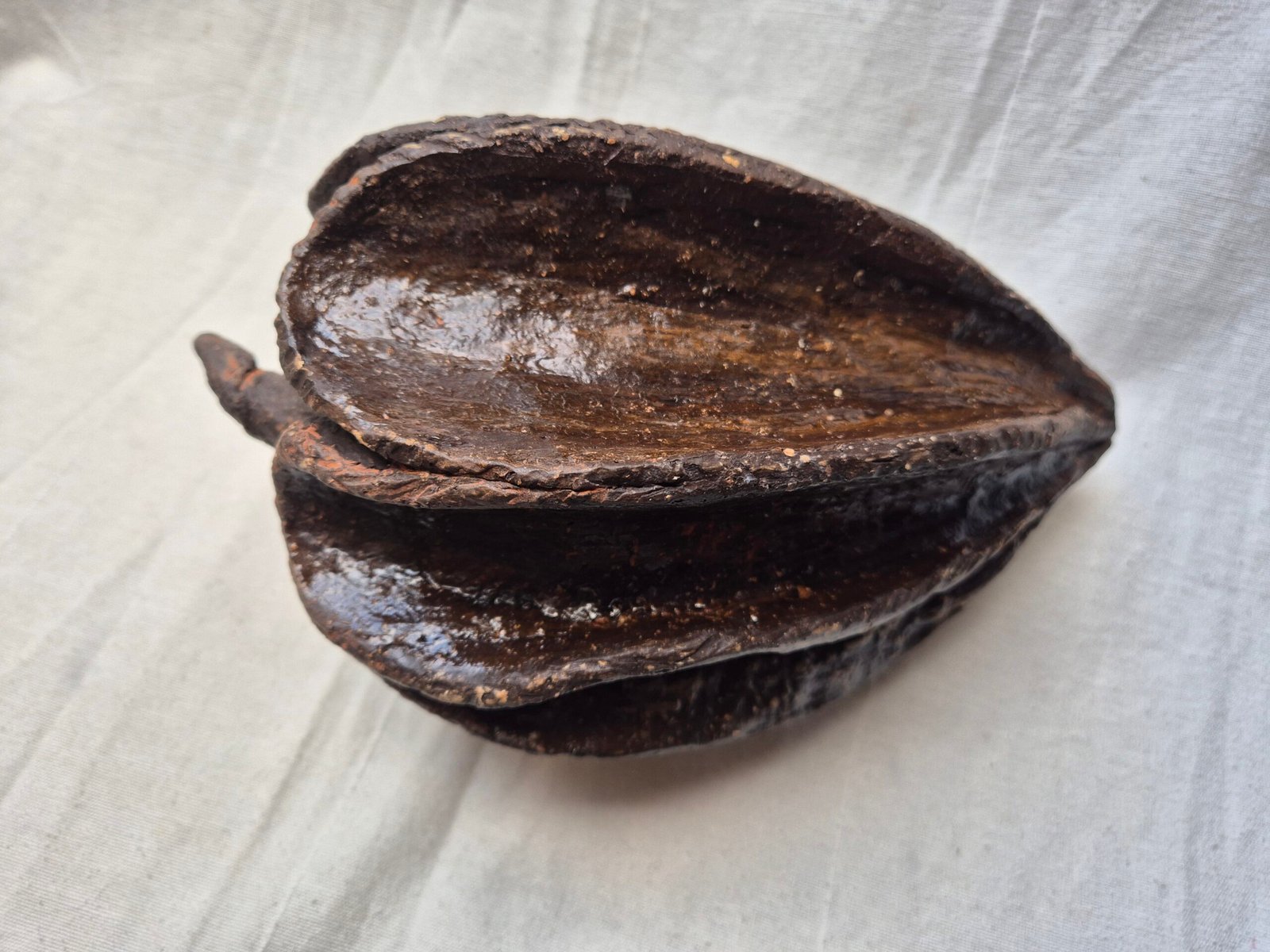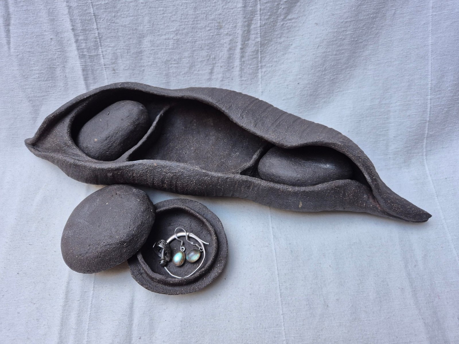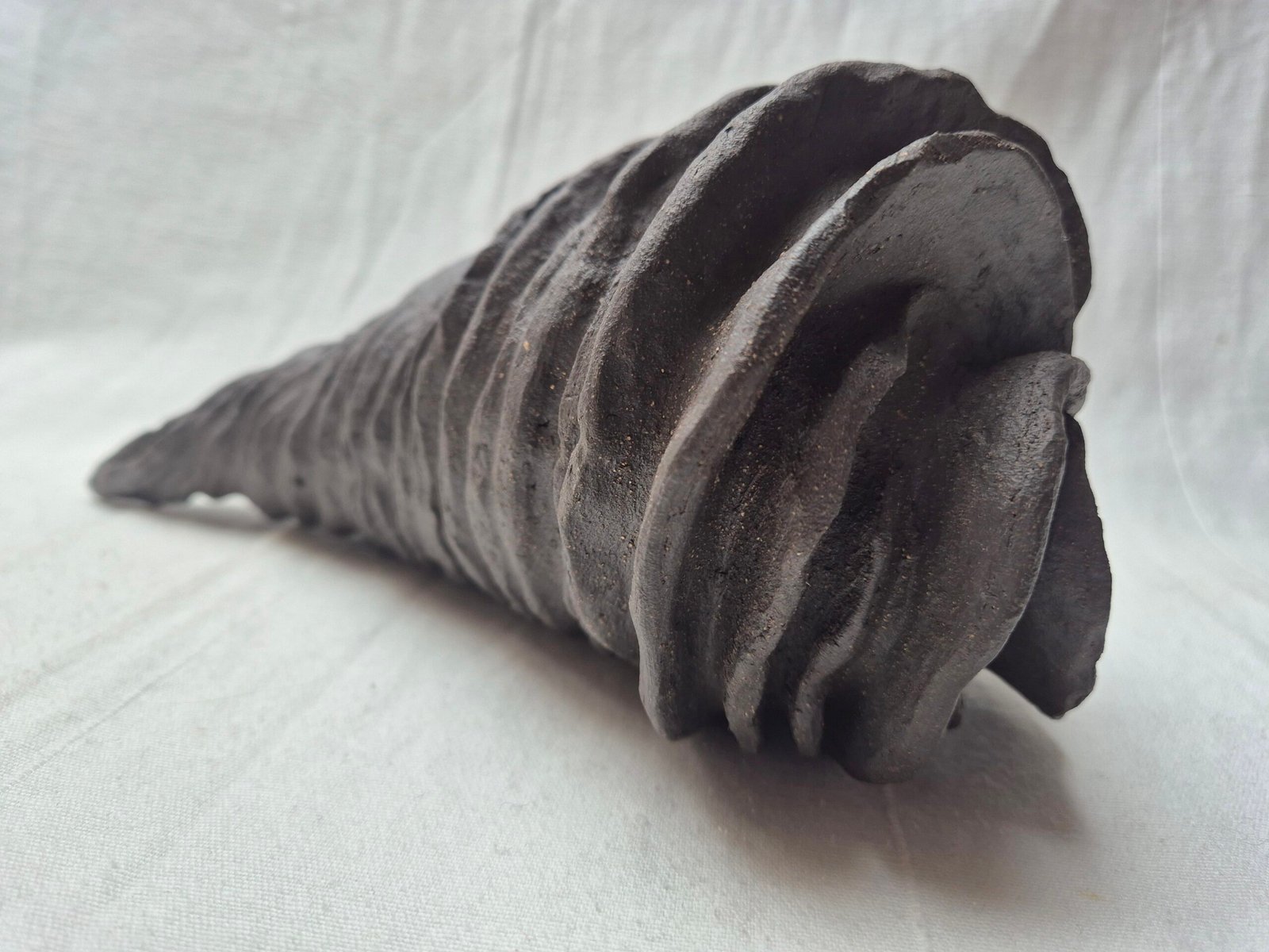 Aan de andere kant ontstaan er natuurlijke vormen van bijna zwartbakkende klei, die hooguit een subtiele oxide krijgen als accent. Deze objecten zijn altijd geïnspireerd op natuurlijke vormen, maar tijdens het maakproces laat ik intuïtie en verbeelding de vrije loop. Zo groeit ieder werk uit tot een uniek object — een spel tussen vorm, materiaal en verbeelding.