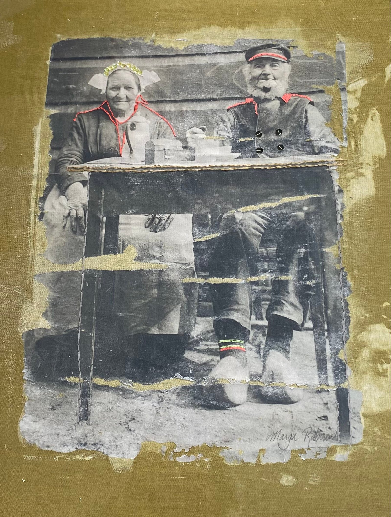 Naast verf, gebruik ik in mijn huidige werk textiel en garen. Textiel geeft warmte, is zacht en organisch. Ik heb vervolgens (familie)foto’s op (oude) lappen of doek aangebracht, waarmee ik middels geërfd borduurgaren en toegevoegde materialen de familie weer tot leven breng.