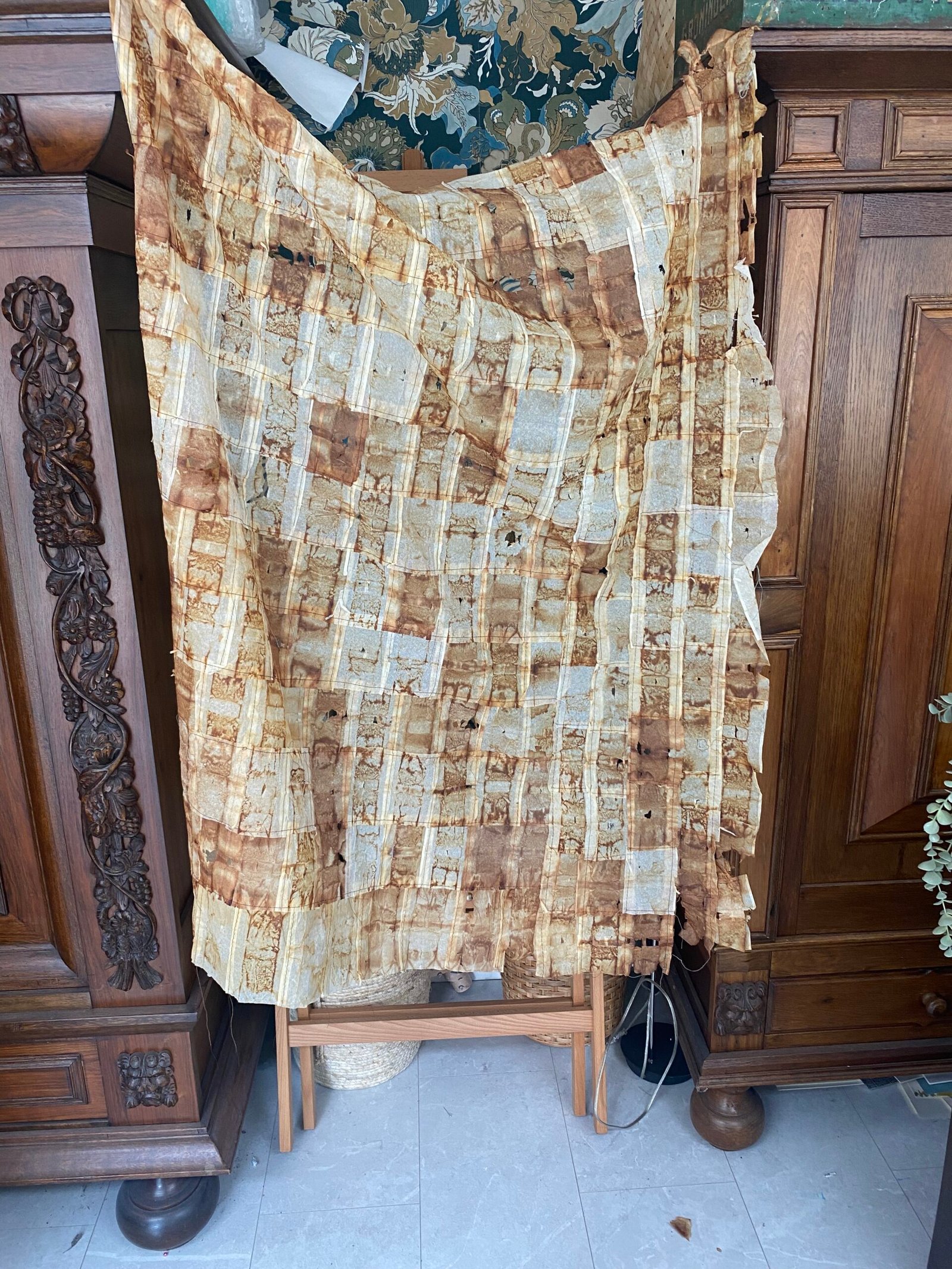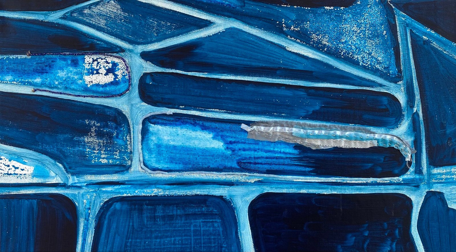 Hoewel ik mijn langste tijd heb geschilderd, ligt mijn voorkeur tegenwoordig bij het combineren van verschillende materialen in een werk. Hierbij krijgt textiel steeds meer mijn voorkeur. Ook houd ik ervan om te werken met materialen die een ander weggooit, zoals pluis uit de droger, kleurdoorloopdoekjes uit de wasmachine en gebruikte theezakjes.