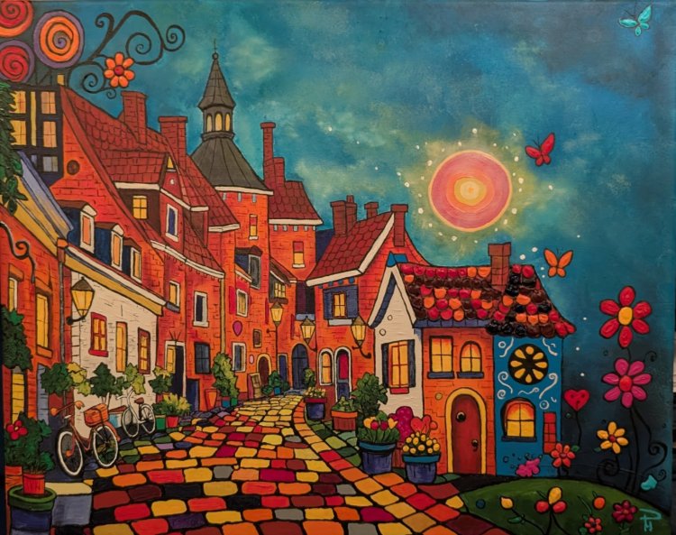 Aangenaam verrast over het plezier en de ontspanning dat dit gaf, ben ik op zoek gegaan naar een workshop om meer te leren. Zo kwam ik in september van dat jaar bij Latent Talent Leusden (cursus ‘acrylverf; tips en tricks’) in een gezellige groep. Nu een aantal jaar verder nog steeds in deze groep actief en op vrije momenten vanuit mijn woonkamer.